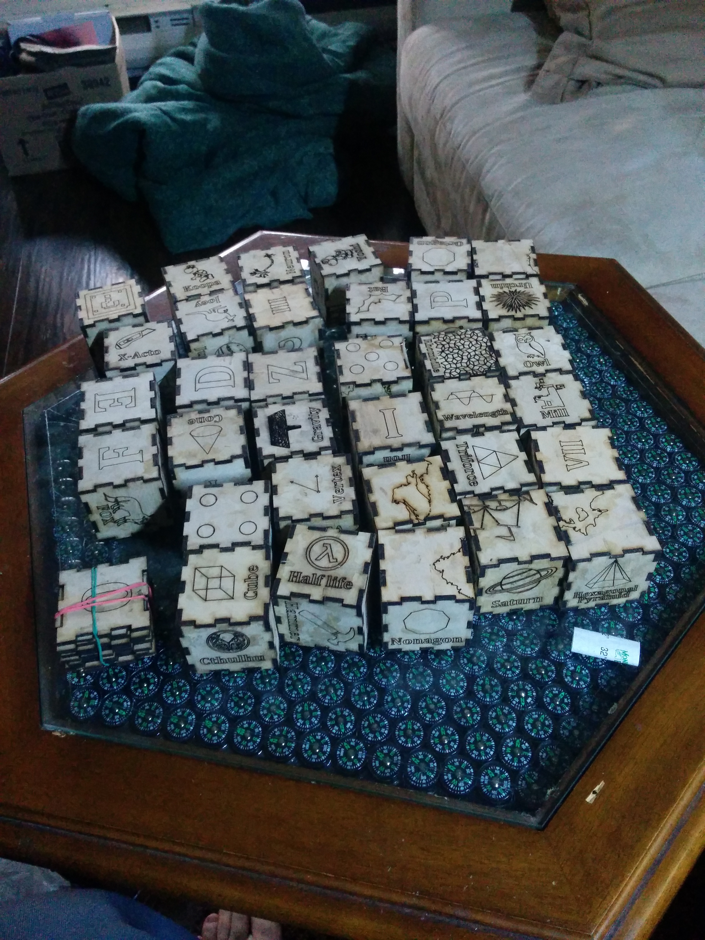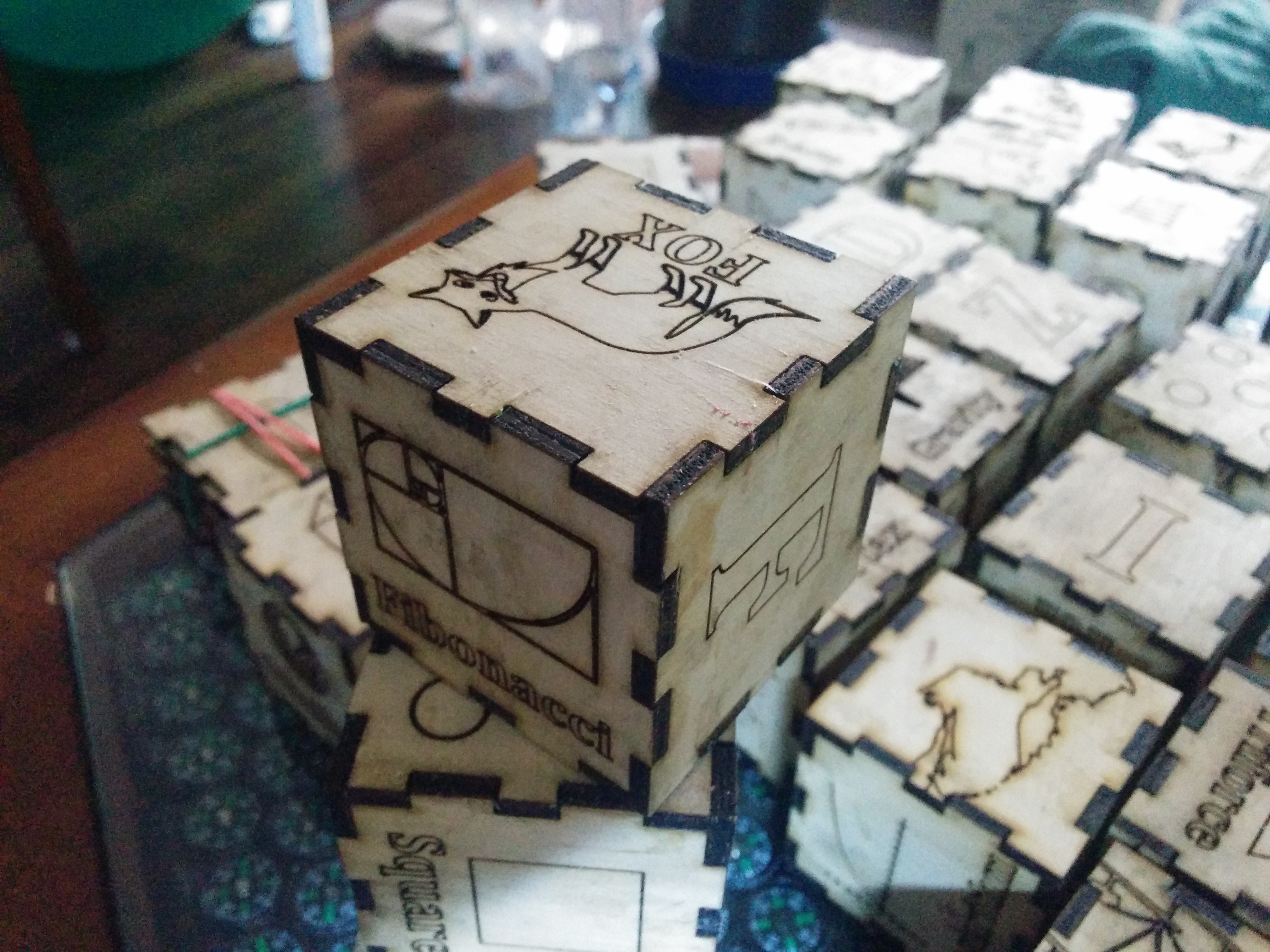 The cubes varnished and drying